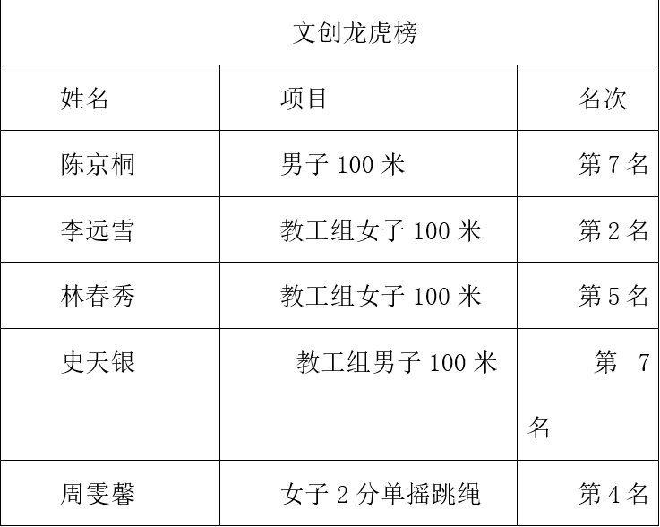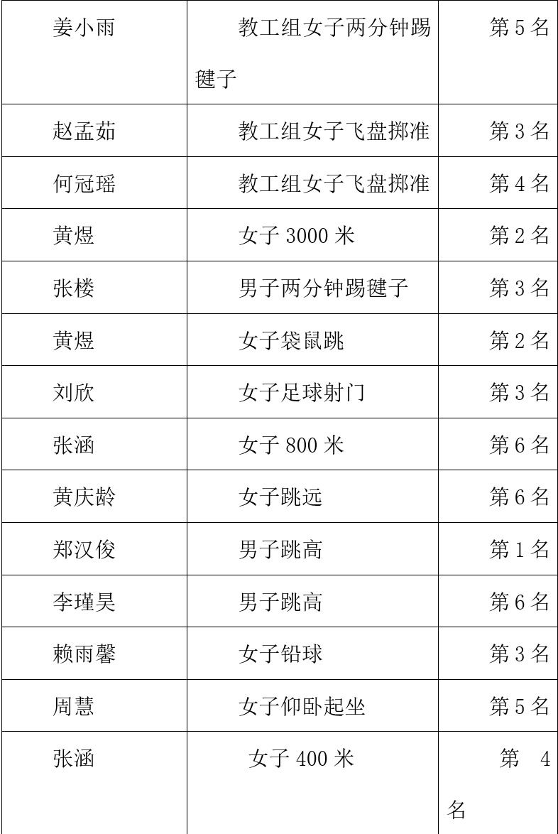 文创学院师生在上午的田赛、径赛预赛中取得优异成绩,预祝他们在后续赛事中再获佳绩。以下是在4月15日上午预赛中进入决赛的老师和同学: