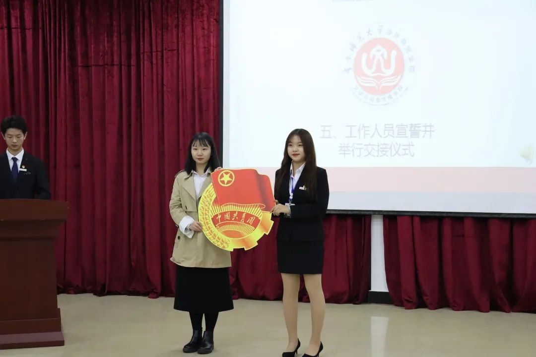 十七届学生组织工作人员向展平带领全体十七届学生组织成员进行宣誓,紧接着十六届学生组织工作人员与新一届工作人员进行交接仪式。