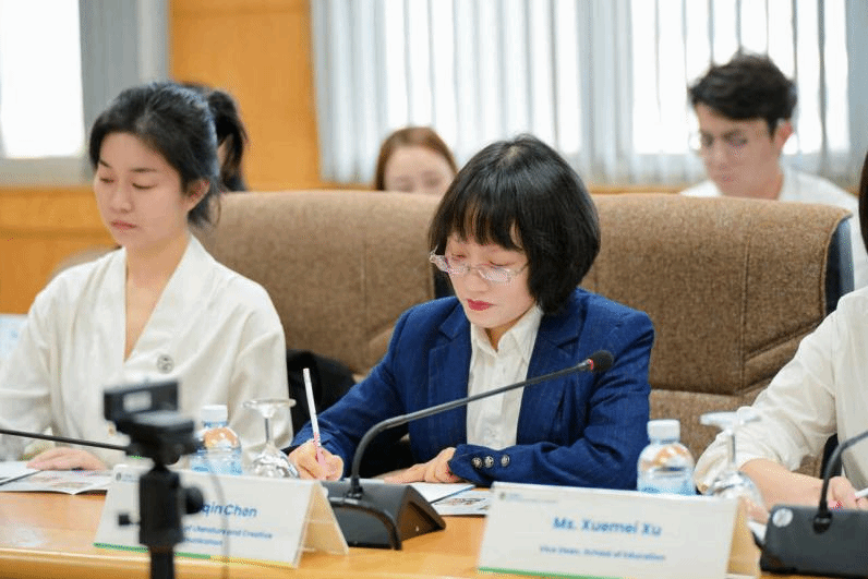 交流活动伊始,代表团在乌隆他尼皇家大学崇敬楼8楼会议室参与校际交流座谈会。双方围绕国际中文教育、数字经济联合培养、汉语教学实习项目等六大议题展开深度研讨。座谈会上,王婕副校长围绕澜湄合作与西部陆海新通道建设背景,结合文学与创意传播学院的学科特色,提出共筑“澜湄人文与创新教育联合研究中心”、共育“澜湄新一代青年学者与拔尖人才”、共织“校地企产学研协同网络”三大合作构想。重点聚焦“跨文化视野下的教师专业发展”“数字时代的人文叙事与传播创新”“艺术设计与社区文化可持续振兴”等方向,与乌隆他尼皇家大学校方深入探讨。陈寿琴副院长则就国际汉语课程共建进行了专项交流。