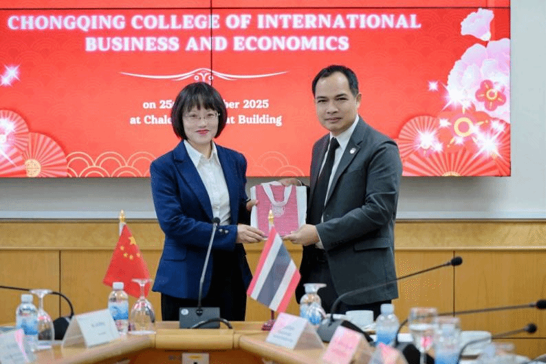 【本网讯】2025年12月25日,时值中泰建交五十周年之际,重庆对外经贸学院副校长王婕率交流代表团赴泰国乌隆他尼皇家大学开展研学交流。文学与创意传播学院副院长陈寿琴教授、教研室主任孟宪丛副教授及汉语国际教育专业学生代表甘雨洁、李恩慧随团出访,共促两校人文教育合作迈向新高度。