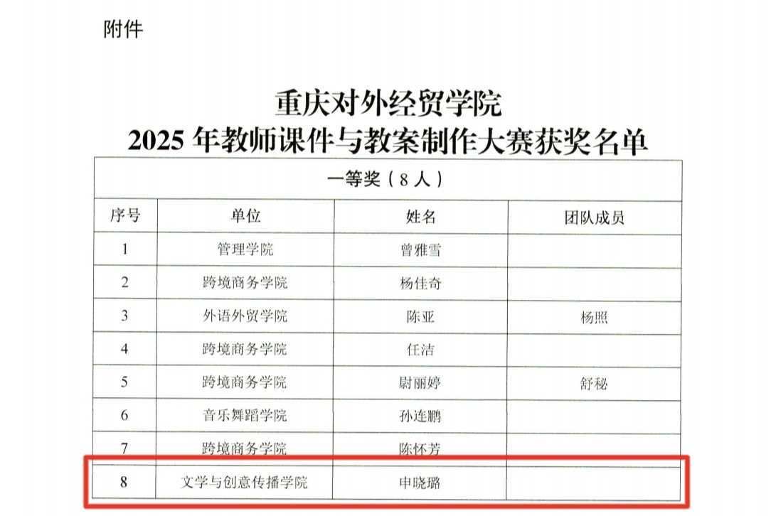 【本网讯】10月14日,重庆对外经贸学院公布2025年教师课件与教案制作大赛结果。经多轮评审,共评选出一等奖8项、二等奖13项、三等奖18项。其中,文学与创意传播学院申晓璐老师凭借出色的表现,荣获大赛一等奖。
