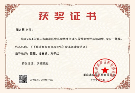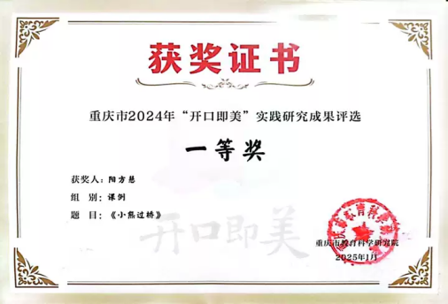 2023年11月,区级“新城杯”第九届中小学师生书法作品邀请赛活动中,获教师组毛笔书法三等奖;2023年12月,市级“川渝地区中小学教师阅读指导优秀案例展评”活动,其教学设计(《做最勇敢的自己》整本书阅读教学设计)获二等奖;2024年1月,区级第39届青少年科技创新大赛,其教师科技论文项目(《论素养导向下信息技术在小学低段语文课堂教学中的运用》)获一等奖;2024年2月,市级第二届小学师生“开口即美”线上大会,获教师组经典诵读三等奖;2024年5月,区级中小学优秀阅读指导课案例(《你看起来好像很好吃》绘本阅读指导课)评选活动一等奖;2025年1月,“公众号”团队在2024-2025学年度上期荣获“校长提名奖”;2025年1月,“开口即美”实践研究成果(《小熊过桥》)获市级一等奖。